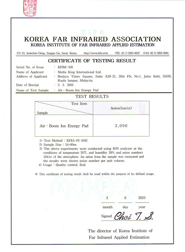 我先生因为生意上的关系,必须经常驾长途车,总觉得很累、困、倦、腰酸背痛,他不想再驾下去了,因在驾车当中疲倦的话,往往会有意想不到的事情发生。身为太太的我在他的生意上帮不上忙,也很当心他的情况,我能做的就是把健康带给他,我口中的健康便是AIR-BOOM,它有奇妙的负离子在其中,他用了之后,几乎感觉不到累,也不会疲倦,因为负离子可以解除疲劳,舒缓神经。他说会把它继续带在身上,永不卸下,陪他走每一个行程。再来就是我母亲,她已经是七十多岁了,她有轻微的眼膜,而且还有红血丝,我把AIR-BOOM蒸在水里,用那个水让我母亲洗眼睛,洗了几次之后感觉到有些清晰了,而且红血丝也消失了。Eric